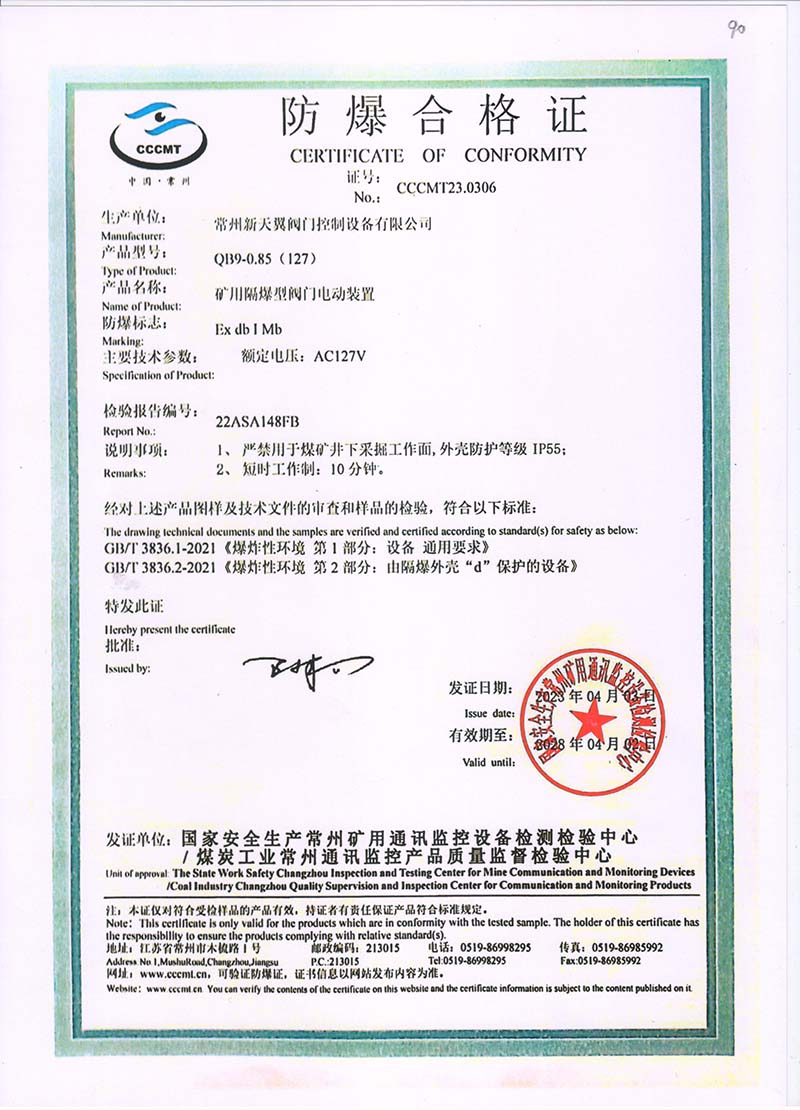 隔爆型DZB 中國國家強制性產品認證證書108.2